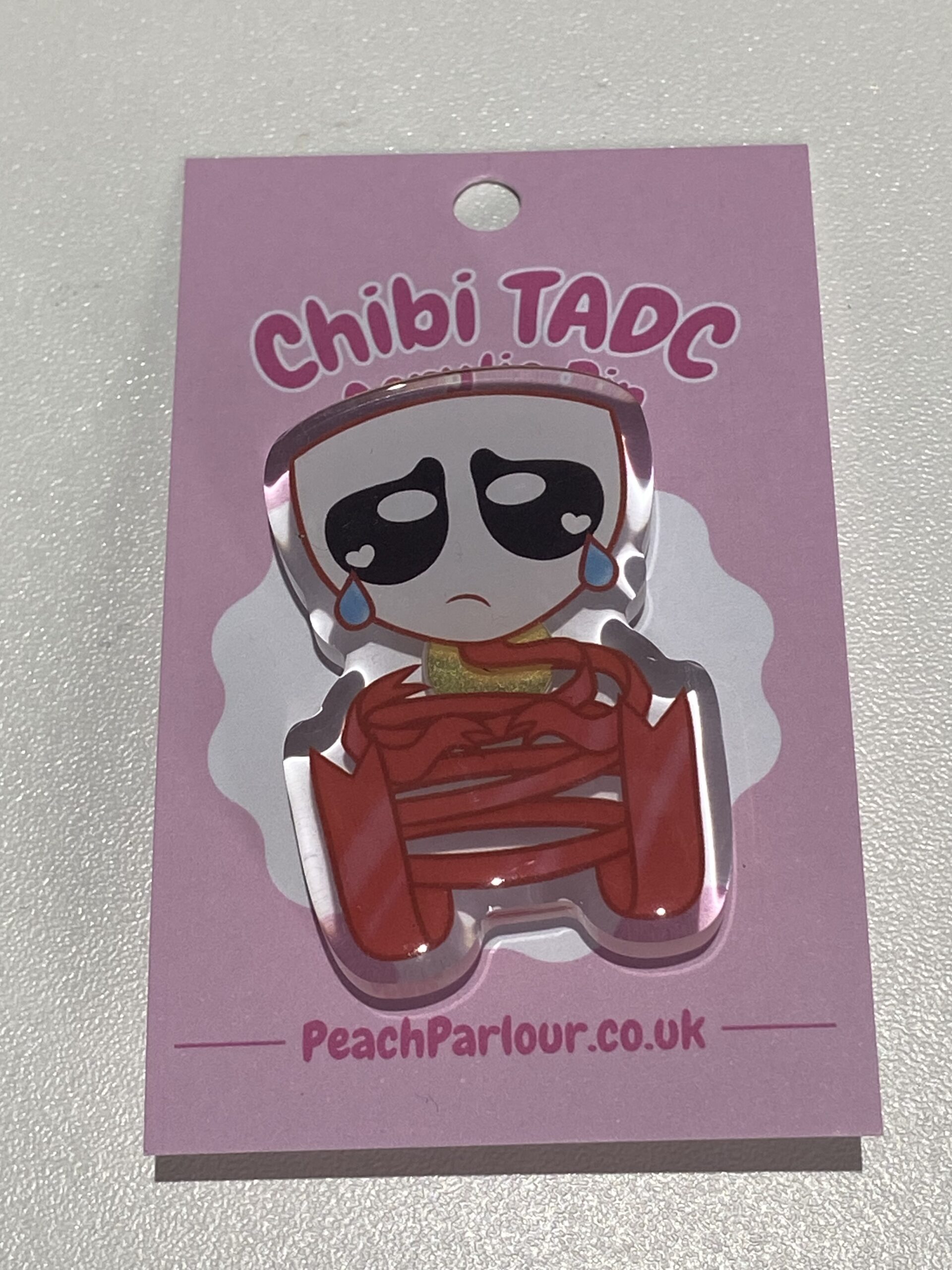 The Amazing Digital Circus acrylic pin, 2 inches. With a pink heart backing.