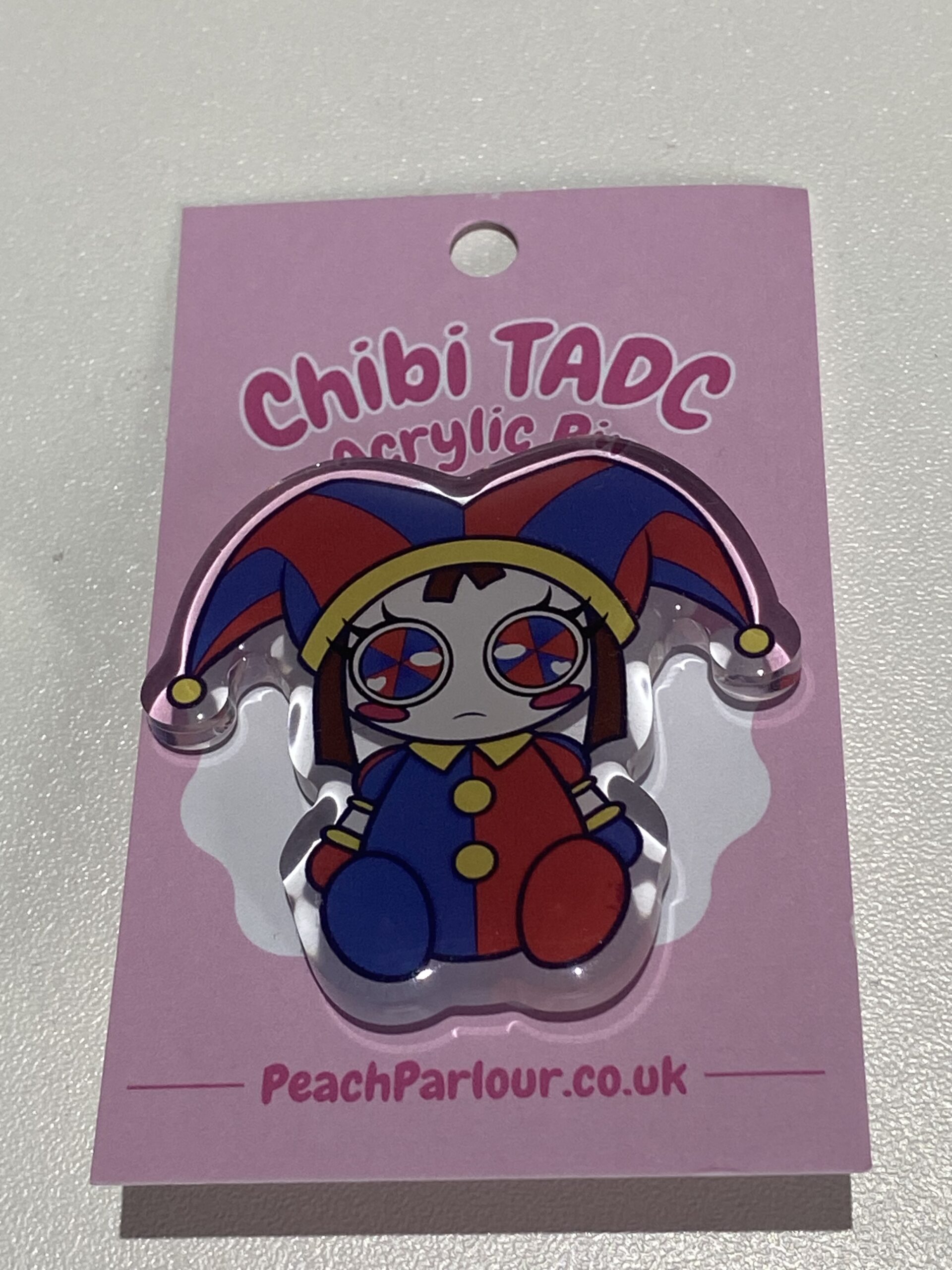 The Amazing Digital Circus acrylic pin, 2 inches. With a pink heart backing.