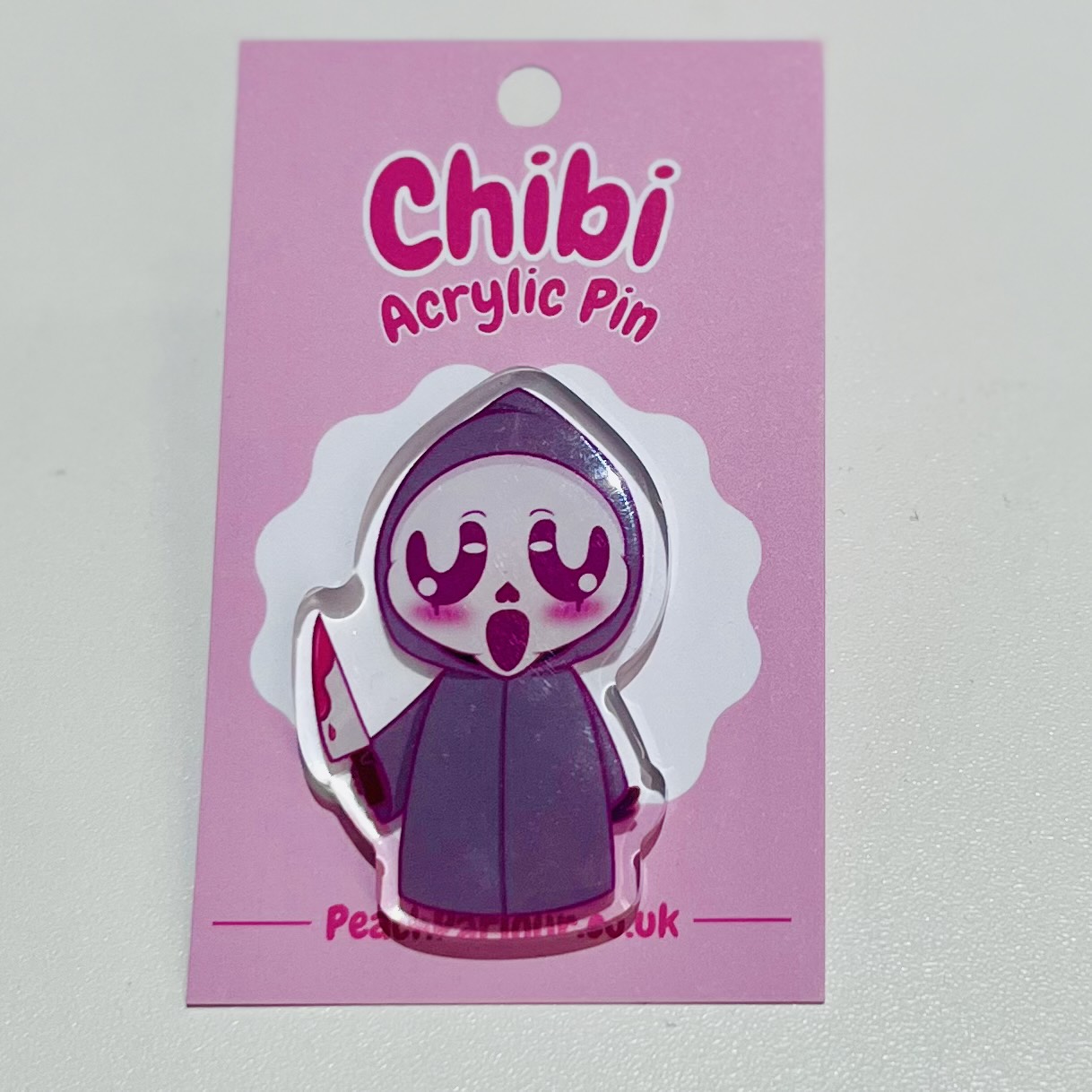 GhostFace acrylic pin, 2 inches. With a pink heart backing.